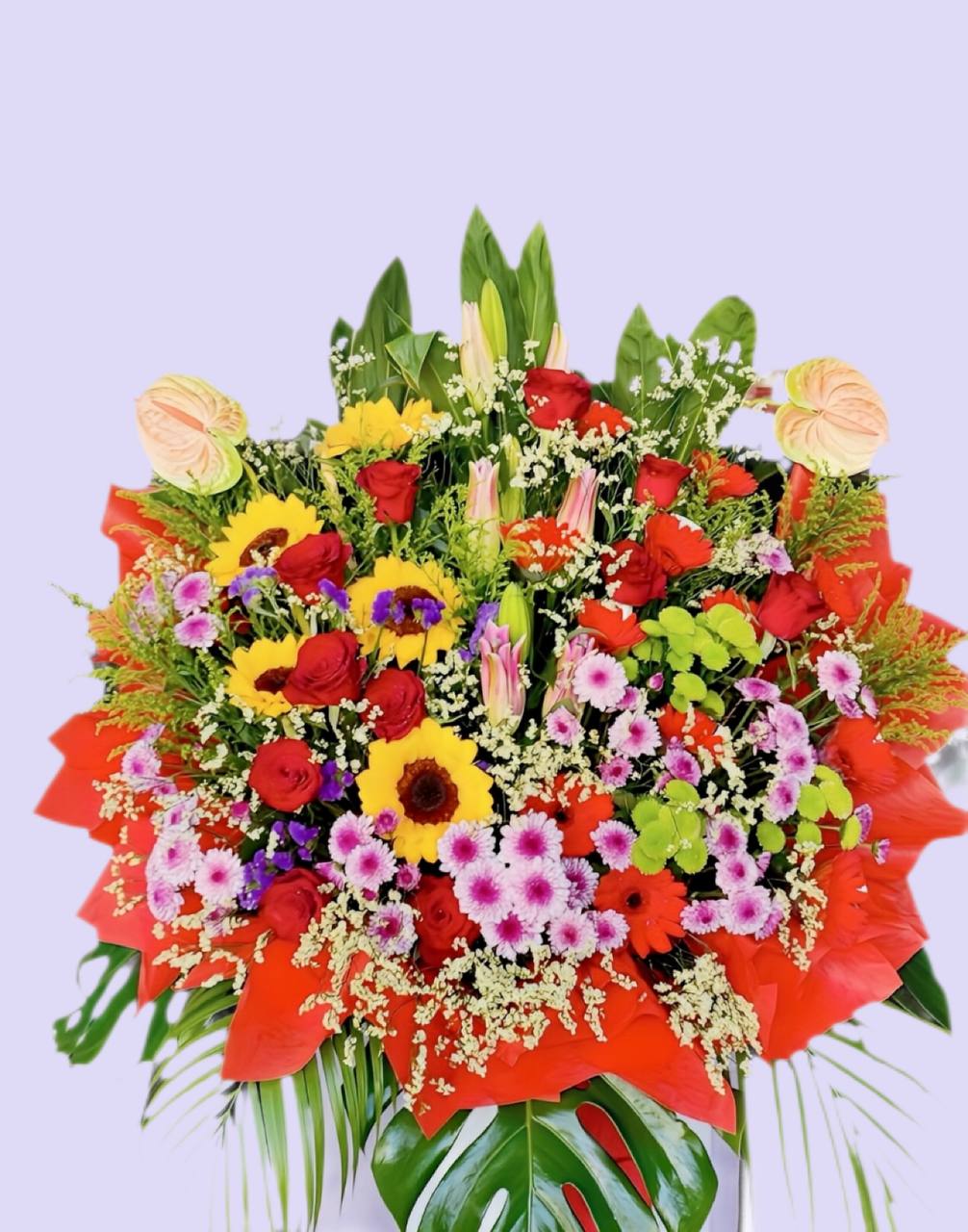 A show-stopping floral masterpiece, featuring sunflowers, roses and exotic foliage. The Majestic Triumph embodies grandeur, elegance, and triumph — a fitting tribute for prestigious openings, milestone anniversaries, or celebrations where only the very best will do. This stand leaves a lasting impression of respect, support, and well wishes.
