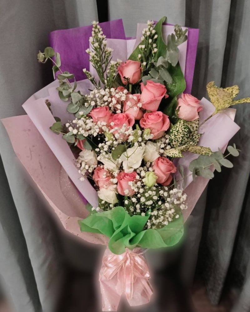 This bouquet is of a generous size and consists of 12 fresh rose stalks. It is complemented with pretty baby’s breath and suitable foliage.